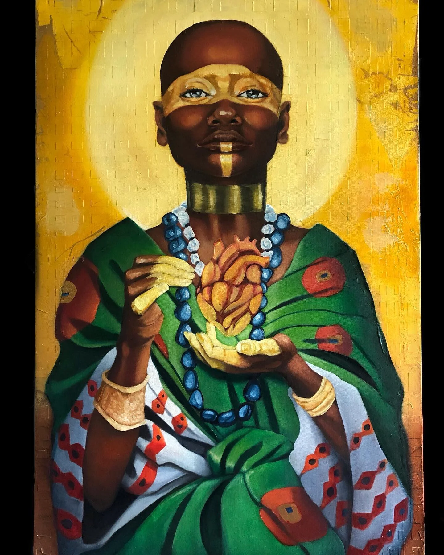 I’ve always wanted to take on the beloved biblical portrait of Mary, mother of Jesus. So when I was asked to do so and with free reign to do it in my style, I quickly jumped at the opportunity. Painting the mother of Jesus as an African bald woman felt power in a way, liberating, and just right. while creating this piece, I understood the connection that many people felt when looking at her image, and sought to achieve that same effect.