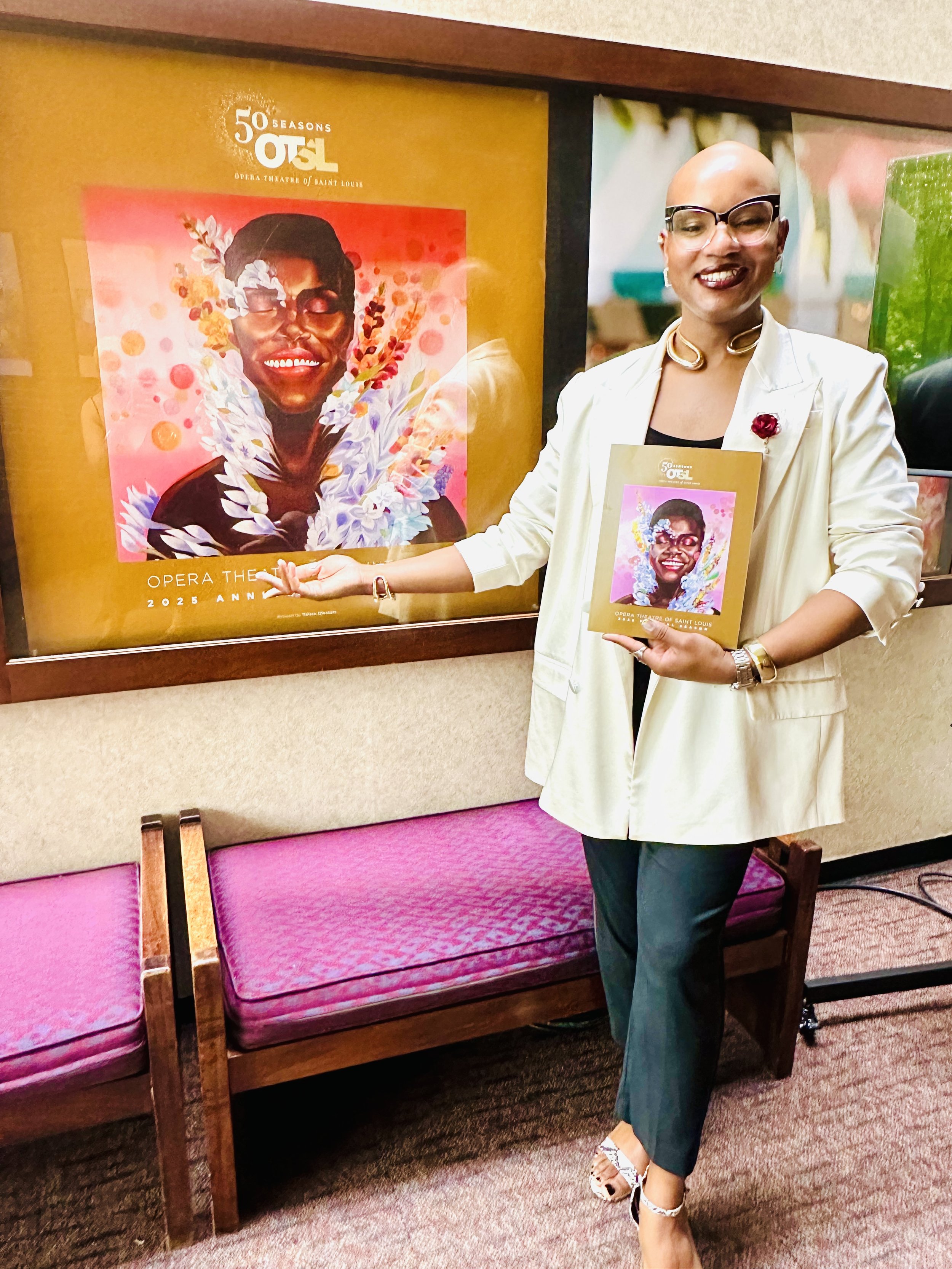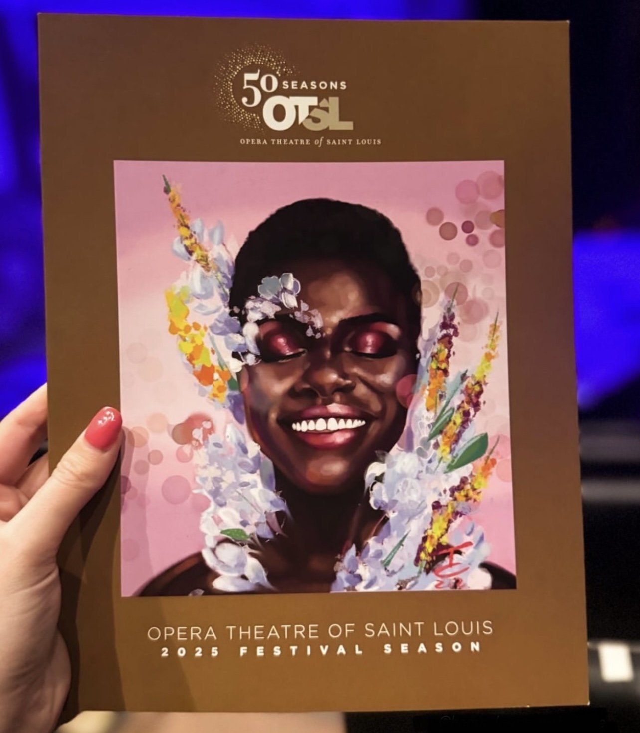 It was 2024, and I was seeing Opera Theatre of St. Louis’ (OTSL“Barber of Seville”. I remember seeing the cover art on the playbill and thinking, “I WILL have my art on the cover. Fast forward to the end of the year, and I received an email asking me to create the cover for their 50th Anniversary season. I didn’t even have to think twice about it. I was easily inspired by Queen Titania of A Midsummer Night’s Dream and Ostara, the Nordic goddess of Spring. I also wanted to create a portrait that highlighted the beauty that black women possess and honor them with this creation. Ladies and gentlemen, Theys and thems. I give you “Joya of Spring”. The painting created is now display within OTSL’s building.